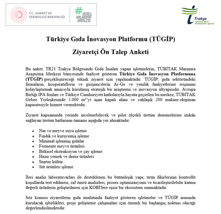 Araçlar Tamamlanmamış anketi yükle Sonra sürdürmek üzere kaydet varsayılan Dikkat: Tarayıcınızda JavaScript betikleri kapatılmış. Bu nedenle bu anketteki tüm soruları yanıtlayamayabilirsiniz. Lütfen tarayıcı ayarlarınızı denetleyin. Ar-Ge, Analiz ve İş birliği İhtiyaç Analizi Anketi Ziyarete katılmak için aşağıdaki formu eksiksiz şekilde doldurunuz. Katılım sağlamak istediğiniz tarihi seçiniz. Bu ankette 27 soru var. BÖLÜM 1 – Firma Profili (Bu sorunun yanıtlanması zorunludur) Firma Adı (Bu sorunun yanıtlanması zorunludur) Formu dolduran kişi ve unvani (Bu sorunun yanıtlanması zorunludur) Cep Telefonu (Örnek : 5321111111) Bu alana yalnızca rakam yazılabilir. (Bu sorunun yanıtlanması zorunludur) E-Posta Adresi (Bu sorunun yanıtlanması zorunludur) Firma faaliyet alanını seçiniz. Aşağıdaki yanıtlardan birini seçin Süt ve süt ürünleri Et ve et ürünleri Tahıl ve unlu mamuller Bitkisel yağlar Meyve-sebze işleme Kuruyemiş Fonksiyonel gıda İçecek Diğer (Bu sorunun yanıtlanması zorunludur) Firma Ölçeğiniz Aşağıdaki yanıtlardan birini seçin Mikro (<10) Küçük (10–49) Orta (50–249) Büyük (250+) (Bu sorunun yanıtlanması zorunludur) İhracat durumunuz Aşağıdaki yanıtlardan birini seçin Yok Dolaylı Doğrudan AB’ye ihracat ABD - Diğer (Bu sorunun yanıtlanması zorunludur) TÜBİTAK TÜGİP Ziyaret Programı tecihinizi belirtiniz. Aşağıdaki yanıtlardan birini seçin 1 Nisan 2026 - Çarşamba 7 Nisan 2026 - Salı 14 Nisan 2026 - Salı 21 Nisan 2026 - Salı (Bu sorunun yanıtlanması zorunludur) Lütfen ulaşım tercihinizi belirtiniz. Aşağıdaki yanıtlardan birini seçin Kendi aracım ile ulaşım sağlayacağım. Yukarıda seçmiş olduğum tarihte Çorlu Ticaret ve Sanayi Odasından hareket edecek olan servisi kullanacağım. BÖLÜM 2 – Ar-Ge Kapasitesi (Bu sorunun yanıtlanması zorunludur) Firmanızda Ar-Ge birimi var mi, var ise kaç çalişanı var. Aşağıdaki yanıtlardan birini seçin Yok Var 1-2 Kişi Var 3-5 Kişi Var 5+ Kişi (Bu sorunun yanıtlanması zorunludur) Son 3 yılda aşağıdakilerden hangilerini yaptınız? Uyanların tümünü seç Yeni ürün geliştirme Ürün iyileştirme Süreç inovasyonu Organizasyonel inovasyon Pazarlama inovasyonu Hiç inovasyon yapılmadı (Bu sorunun yanıtlanması zorunludur) Ar-Ge harcamalarınızın ciroya oranı Aşağıdaki yanıtlardan birini seçin %0 %1–2 %3–5 %5+ (Bu sorunun yanıtlanması zorunludur) Son 5 yılda aşağıdaki desteklere başvurdunuz mu? Uyanların tümünü seç TÜBİTAK KOSGEB Kalkınma Ajansı TAGEM AB projeleri Hiçbiri (Bu sorunun yanıtlanması zorunludur) Başvurmama nedeniniz nedir? Aşağıdaki yanıtlardan birini seçin Proje yazma kapasitesi yok Bürokrasi Finansman Süreç uzun Bilgi eksikliği İhtiyaç duymadık BÖLÜM 3 – Analiz ve Laboratuvar İhtiyaçları (Bu sorunun yanıtlanması zorunludur) Hangi analizlere ihtiyaç duyuyorsunuz? Uyanların tümünü seç Mikrobiyolojik analiz Pestisit Ağır metal Aflatoksin Raf ömrü Besin değeri Protein analizi Ambalaj testleri İhracat sertifikasyon analizleri Diğer (Bu sorunun yanıtlanması zorunludur) Analizleri nasıl karşılıyorsunuz? Uyanların tümünü seç Kendi laboratuvarımız Özel laboratuvar Üniversite Kamu Yurtdışı (Bu sorunun yanıtlanması zorunludur) Raf ömrü belirleme yöntemi Uyanların tümünü seç Sistematik test Tahmini Dış laboratuvar Yapılmıyor BÖLÜM 4 – Teknoloji ve Proses (Bu sorunun yanıtlanması zorunludur) Aşağıdaki alanlarda teknik destek ister misiniz? Uyanların tümünü seç Proses optimizasyonu Enerji verimliliği Fermentasyon Ekstraksiyon Liyofilizasyon Spray drying Bitkisel protein izolasyonu Isıl işlem optimizasyonu Diğer: (Bu sorunun yanıtlanması zorunludur) Dijital sistem kullanımı Uyanların tümünü seç ERP Dijital kalite kontrol E-ticaret Veri analitiği Hiçbiri (Bu sorunun yanıtlanması zorunludur) Teknoloji kullanım seviyeniz Aşağıdaki yanıtlardan birini seçin Yetersiz Kısmen yeterli Yeterli İleri BÖLÜM 5 – İhracat ve Regülasyon İhracat yapmıyorsanız en büyük engel nedir? (İhracat yapıyorsanız boş bırakabilirsiniz.) Aşağıdaki yanıtlardan birini seçin Sertifikasyon Raf ömrü Ürün standardizasyonu Pazar bilgisi Finansman (Bu sorunun yanıtlanması zorunludur) Aşağıdaki alanlarda destek ihtiyacınız var mı? Uyanların tümünü seç AB mevzuatı FDA Novel food Sürdürülebilirlik Coğrafi işaret BRC / IFS BÖLÜM 6 – Fikri Mülkiyet (Bu sorunun yanıtlanması zorunludur) Patent başvurusu yaptınız mı? Uyanların tümünü seç Evet Hayır (Bu sorunun yanıtlanması zorunludur) Yapmadıysanız nedeni Aşağıdaki yanıtlardan birini seçin Bilgi eksikliği Maliyet Gerek duymadık Yenilik düzeyi düşük BÖLÜM 7 – İşbirliği ve Kümelenme (Bu sorunun yanıtlanması zorunludur) Üniversite ile işbirliği yaptınız mı? Aşağıdaki yanıtlardan birini seçin Evet Hayır (Bu sorunun yanıtlanması zorunludur) Aşağıdaki işbirliği modellerine nasıl bakarsınız? Uyanların tümünü seç Ortak Ar-Ge Pilot üretim Ortak ihracat Ortak satın alma Danışmanlık (Bu sorunun yanıtlanması zorunludur) Ortak pilot tesis kullanımı Aşağıdaki yanıtlardan birini seçin Düzenli Proje bazlı Sadece analiz İlgi yok Gönder Tamamlanmamış anketi yükle Sonra sürdürmek üzere kaydet Yanıtınızı silmek istediğinizden emin misiniz? Çık ve anketi temizle
